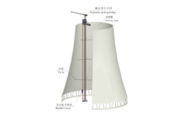 該機(jī)是冷卻塔施工的專用設(shè)備,與升降機(jī)配合使用,頂部塔機(jī)可以吊運(yùn)鋼筋,塔身為升降機(jī)提供附著支撐,水平吊橋?yàn)槭┕と藛T和物料提供平臺(tái)。